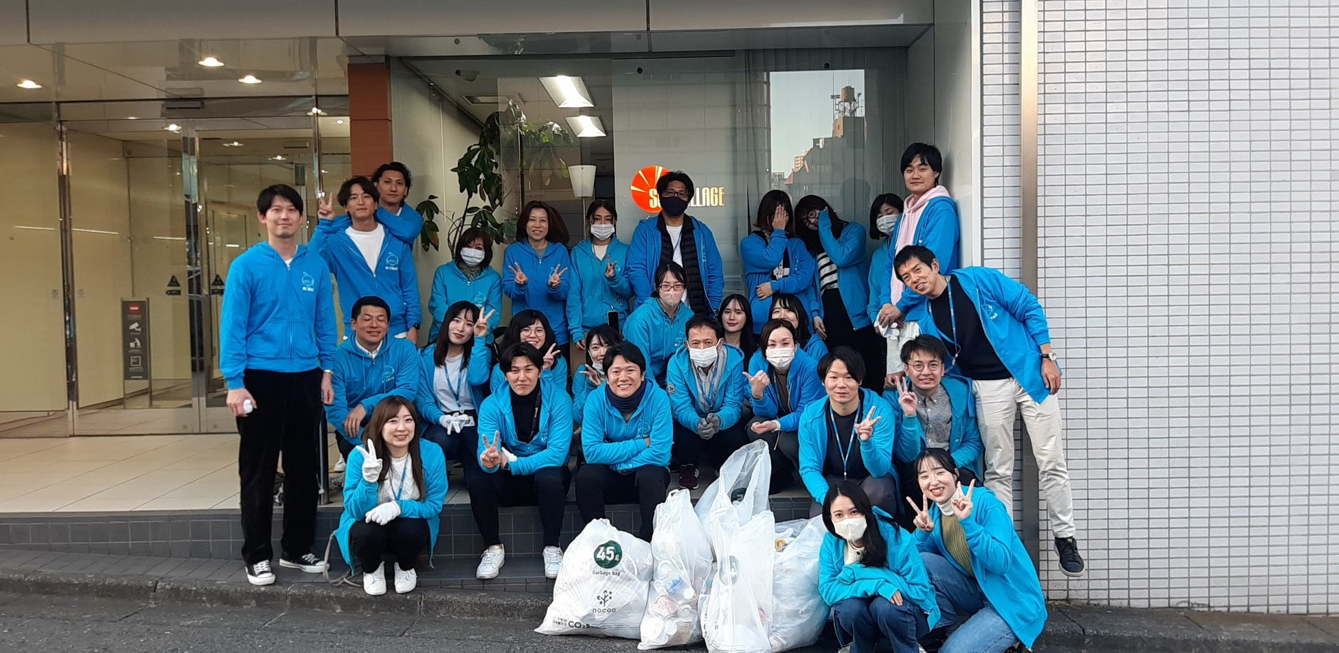 企画を実施した日は、各日40名ほどが参加し、複数グループに分かれて、渋谷本社周辺を歩きながら清掃活動を実施しました。道路沿いの植え込みや駐車場付近に捨てられたタバコの吸い殻や空のペットボトル、折れた傘などを約1時間にわたって収集し、どのグループが最もゴミを拾うことができたかで盛り上がる姿も多く見られました。また、清掃の際にはコーポレートカラーである青のパーカーを着用し、社員の一体感を強く感じながら活動することができました。