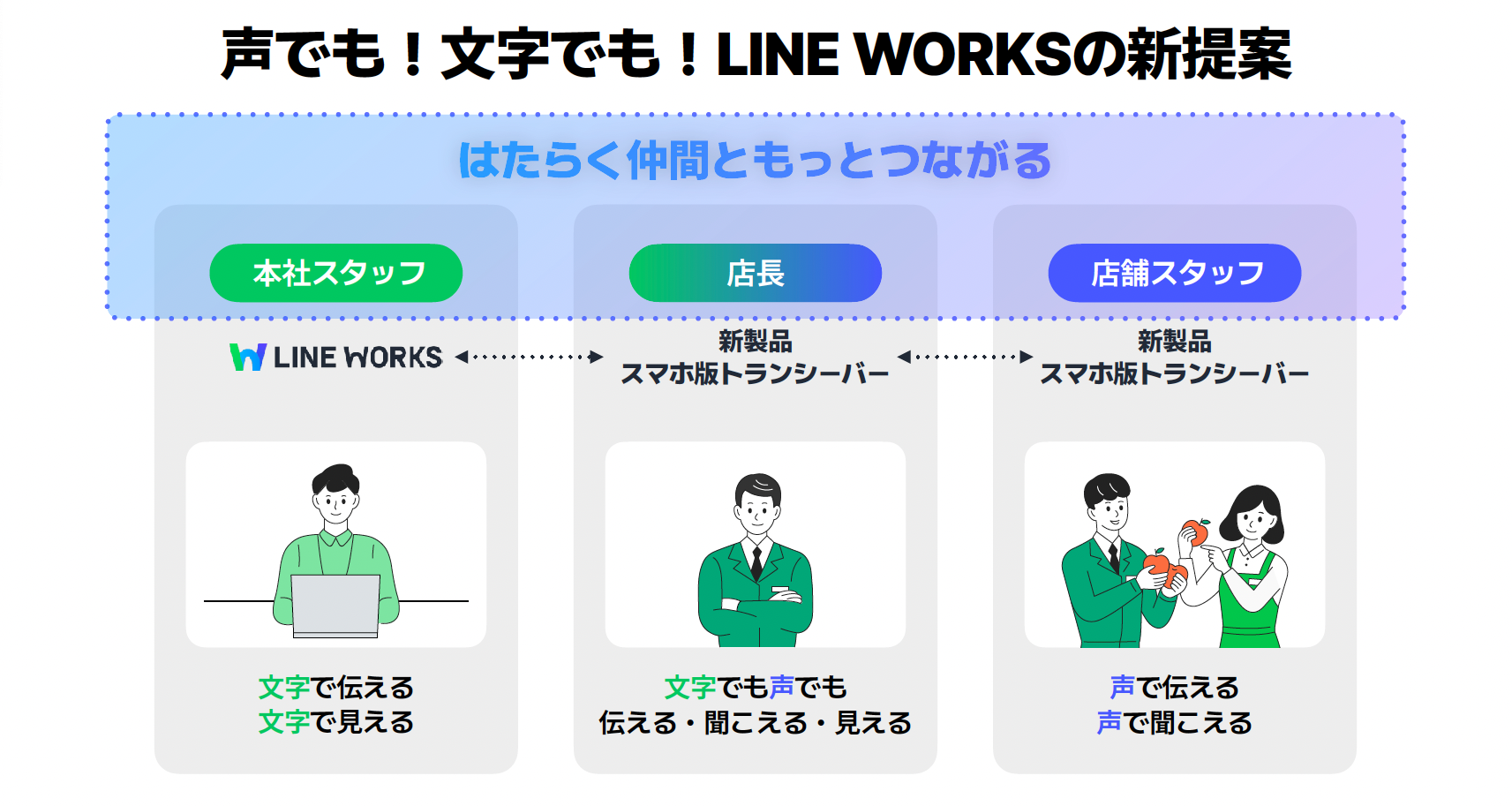 今回発表した新製品は、こうしたコミュニケーション上の課題を解決します。LINE WORKS AI製品の音声AI技術を活用し、「声」を「文字」に、「文字」を「声」に変換することで、「LINE WORKS」を通じて「声」と「文字」を融合したシームレスなコミュニケーションが可能になります。