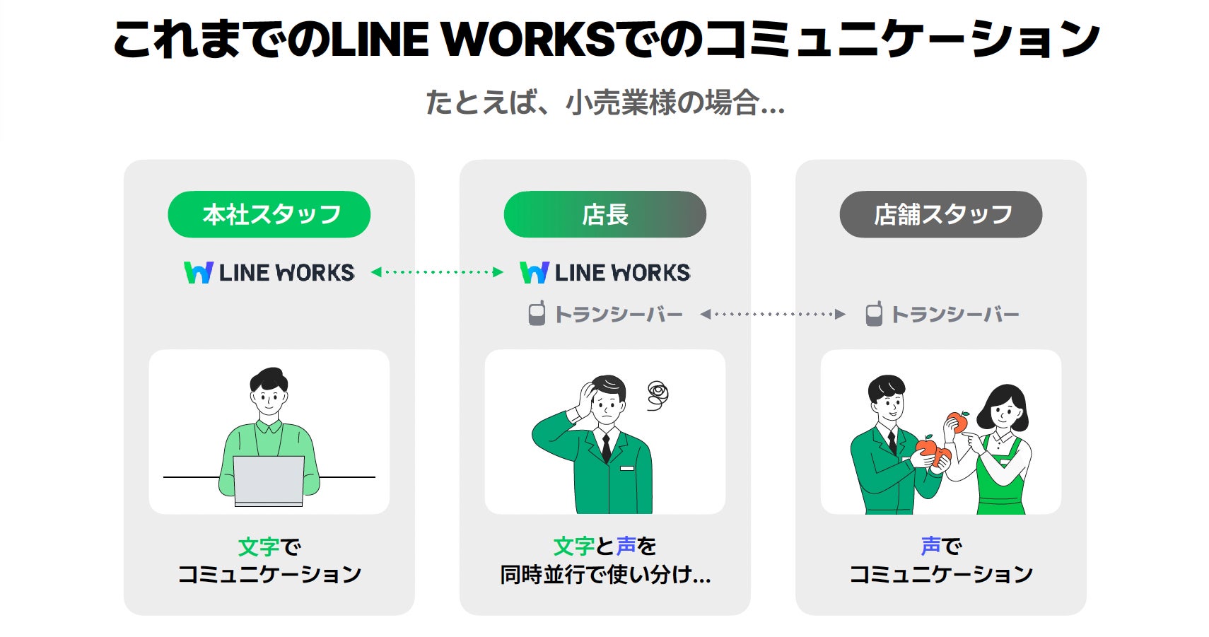 この新製品は、現場で働く、トランシーバーに慣れた方々にとって使いやすさを感じていただけるよう、ゼロから検討・構築しました。「LINE WORKS」とは別の、まったく新しいアプリとしてリリースをします。ただ、このアプリと「LINE WORKS」はチャット機能でつながっているため、現場から「声」で伝えた内容が「文字」に変換され、本部では「LINE WORKS」のチャット上から「文字」で確認できます。また、現場のスタッフは「LINE WORKS」のチャット上で送られた「文字」を「声」として聞くことができ、作業中でも円滑なコミュニケーションが可能となります。既にLINE WORKSを利用中のユーザーであれば、既存の環境を活用し、簡単に新しい音声コミュニケーションツールを取り入れられるため、業務の効率化や生産性の向上をすぐに実現することが可能となります。