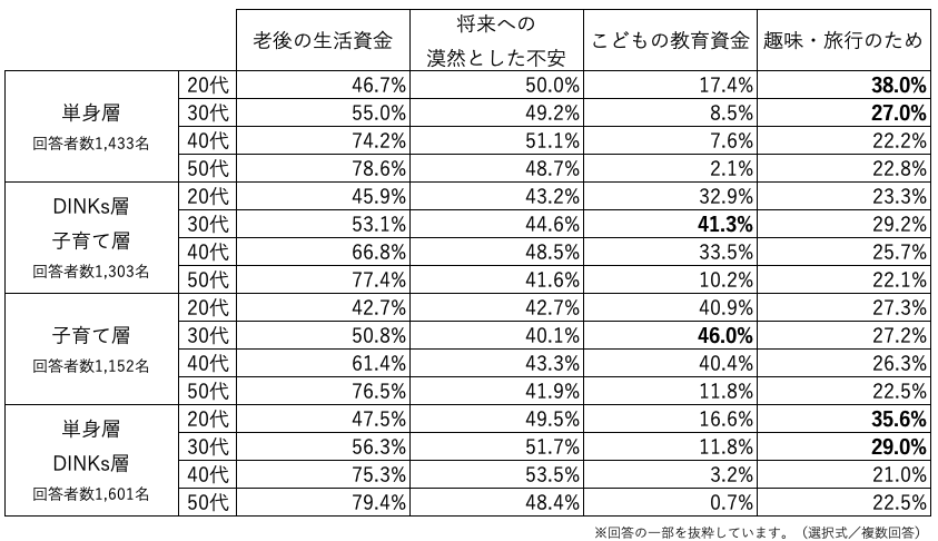 資産形成の目的はライフステージとともに変化。20代〜30代の単身・DINKs層は「今」を、子育て層は「将来」を重視