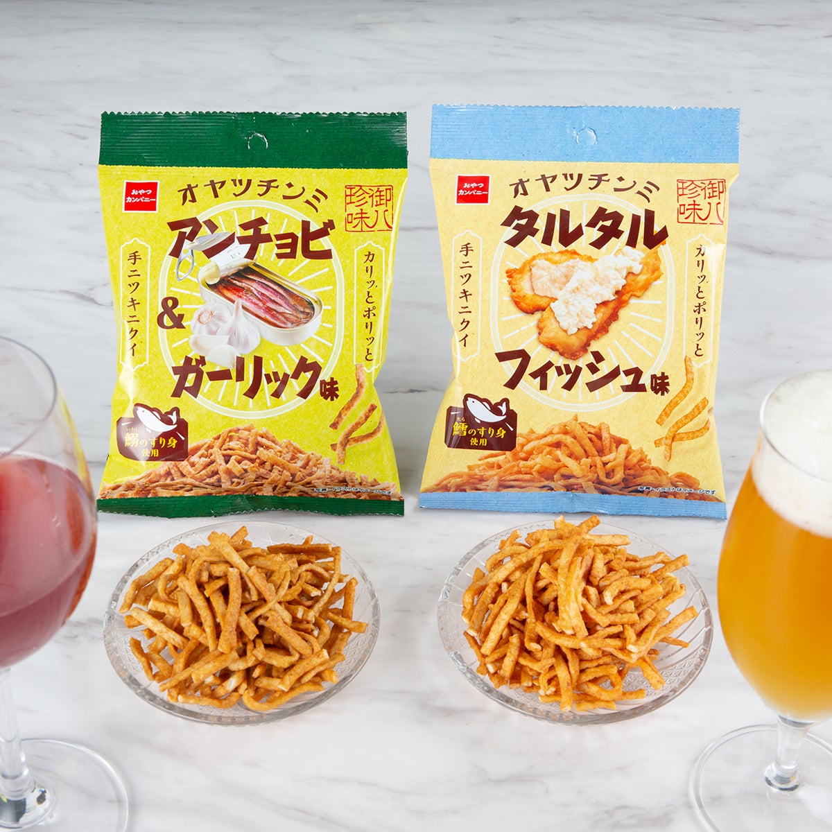 1959年の発売から60余年となるベビースターラーメンは、麺の生地に様々な素材を練り込んで味付けすることで油で揚げても粉や油が“手につきにくい”製法で作られています。「オヤツチンミ」はこのベビースターラーメンの製法を応用し、衣をつけずにフライすることで粉や油が“手につきにくい”のに、揚げ物のおつまみらしいカリッポリッとした食感を実現。魚介のすり身を生地にたっぷりと練りこむことで、味わい深い魚介の風味を楽しめる、