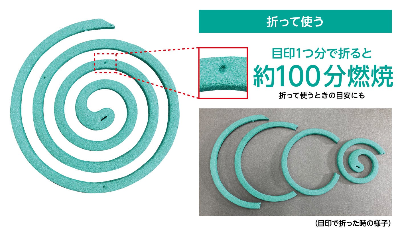 そこで今回、『アース渦巻香 10巻箱入』に約100分毎に燃焼時間の目印をつけ、折って使う際にも便利な仕様にリニューアルしました。ガーデニングやバーベキューなど短時間だけ使用する際におすすめです。
