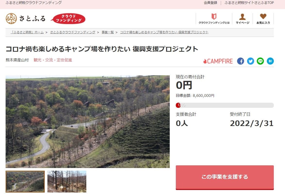 熊本県産山村とふるさと納税ポータルサイト「さとふる」(https://www.satofull.jp/)を運営する株式会社さとふる(本社:東京都中央区、代表取締役社長:藤井 宏明)は、寄付金の使途に応じて事業を立ち上げ寄付を募る「さとふるクラウドファンディング」(https://www.satofull.jp/projects/top.php)にて、令和2年豪雨で甚大な被害を受けた「ヒゴタイ公園キャンプ村」を再建し、ワーケーションへの活用などコロナ禍のニーズに合わせたキャンプ場としてリニューアルするため、2022年1月21日より寄付受け付けを開始します。