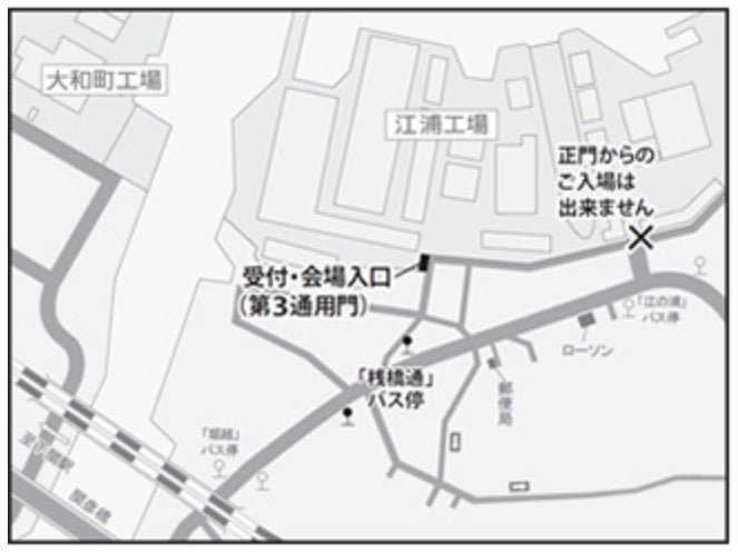 (2)工場及び工場周辺には駐車場がありませんので、ご来所の際は公共交通機関を利用ください。