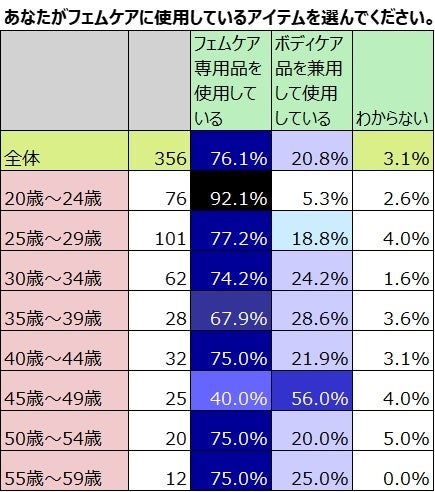専用品でフェムケアをしているのは約8割。フェムケアをしている女性の満足度は約8割。無香料使用者は約3割。
