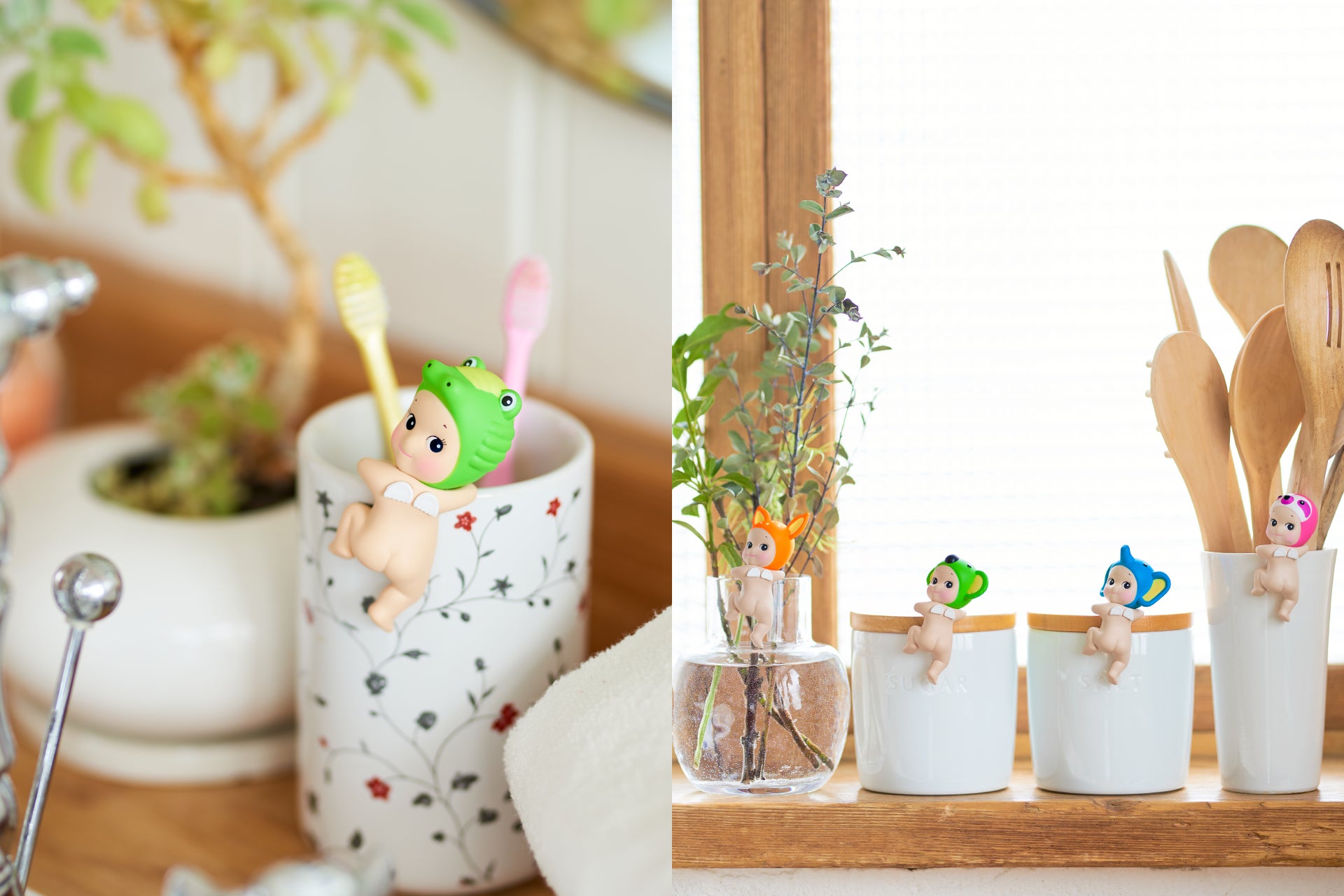 デスク周りや身の回りのものによじ登るソニーエンジェル。こちらを振り向き、仕事や勉強に励むあなたを、やさしく見守ります。ソニーエンジェルとふと目があったときに、心が癒されるでしょう。