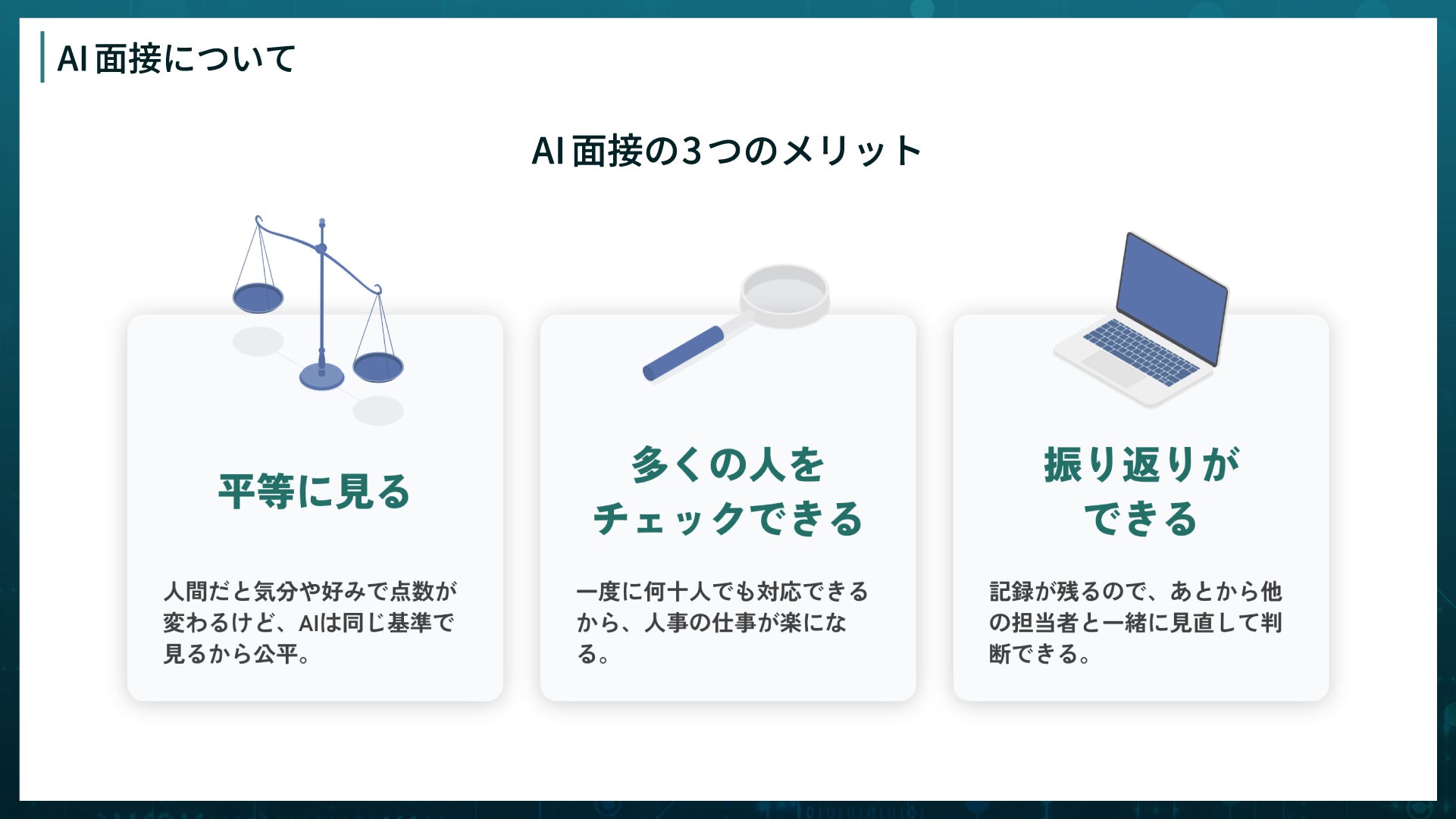面接官の主観や評価ブレを排除し、AIが一貫した基準で候補者を評価。