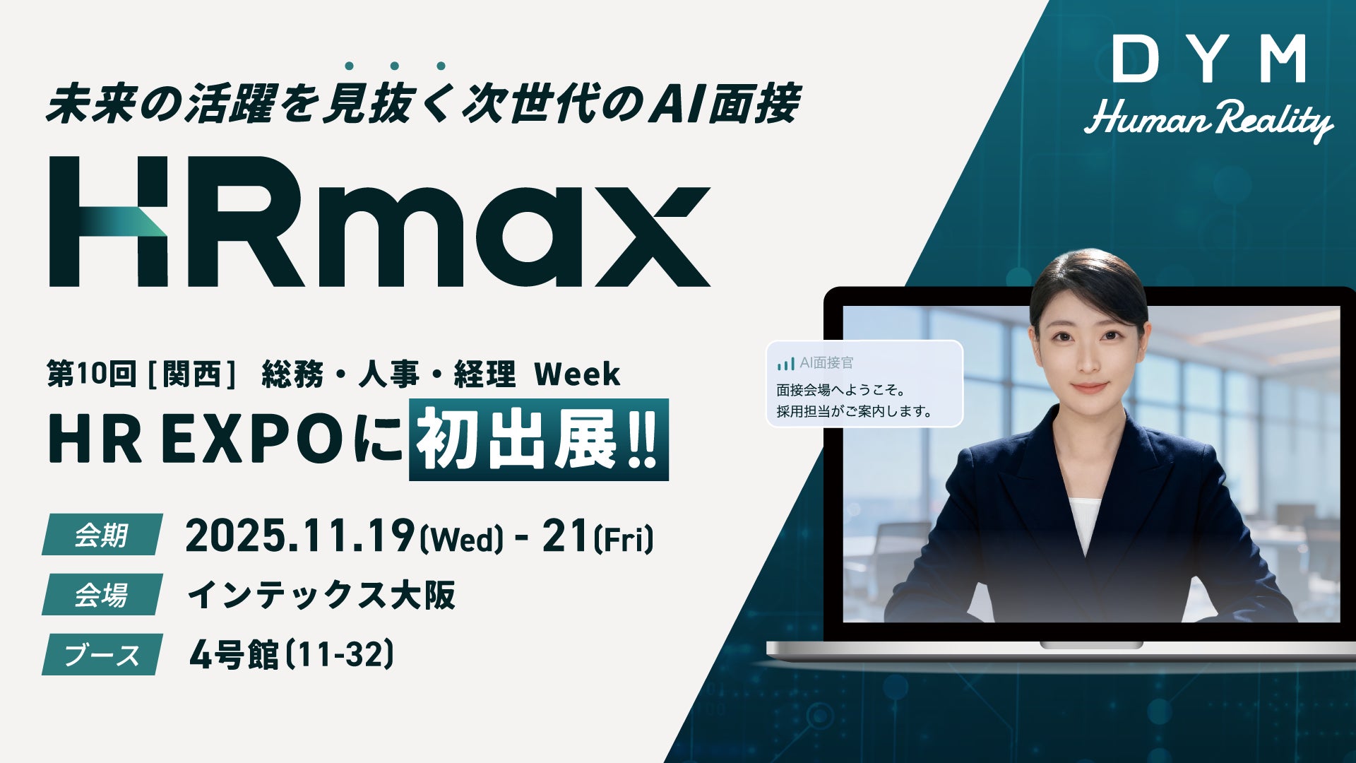 人材事業、WEB事業、海外医療事業などを中心に、M&A事業やスポーツ事業など多角的に事業を展開する株式会社DYM(読み:ディーワイエム、本社:東京都品川区、代表取締役社長:水谷佑毅)のグループ会社である株式会社DYM HumanReality(本社:東京都品川区/代表取締役:佐々木聡祐)は、10月にトライアルサービスを開始したAI面接サービス『HRmax』を、2025年11月19日(水)から21日(金)にかけてインテックス大阪で開催される「第10回【関西】総務・人事・経理Week」に出展します。