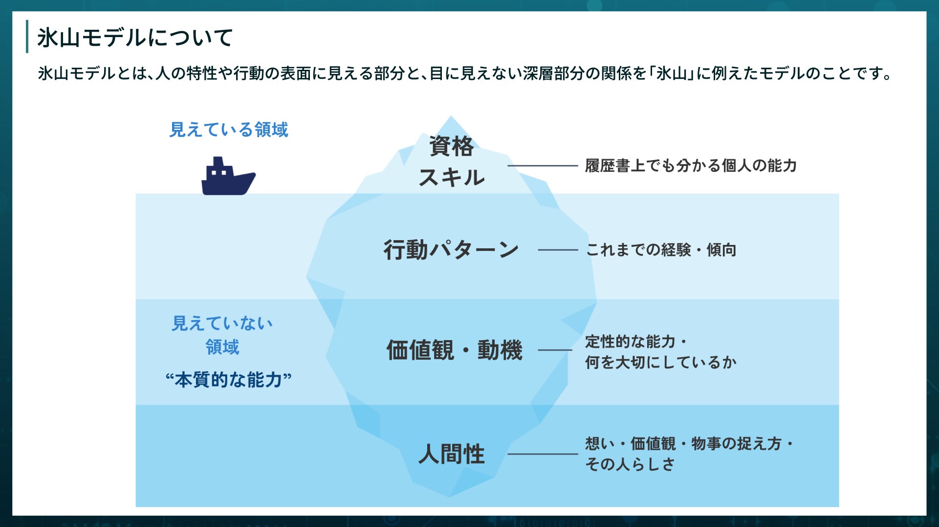 HRmaxの「氷山モデル」により、スキルや経歴の表層だけでなく、潜在的な人間性・動機・価値観まで分析。