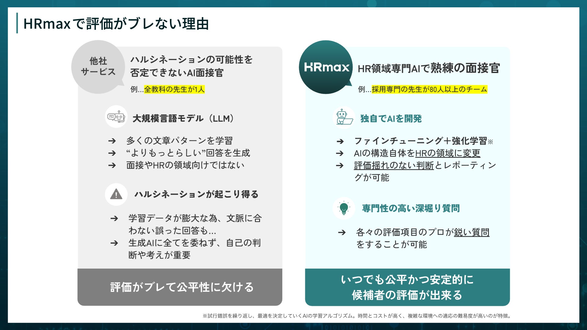 それに対し「HRmax」は、HR領域に特化して独自開発した専門AIを搭載しています。80項目の指標を学習させることで、まるで80人以上の採用専門家の知見をAIに組み込んだかのように、ファインチューニングと強化学習によりHR領域に最適化されています。これにより、ハルシネーションのリスクを抑え、評価のブレがない安定した判断が可能です。