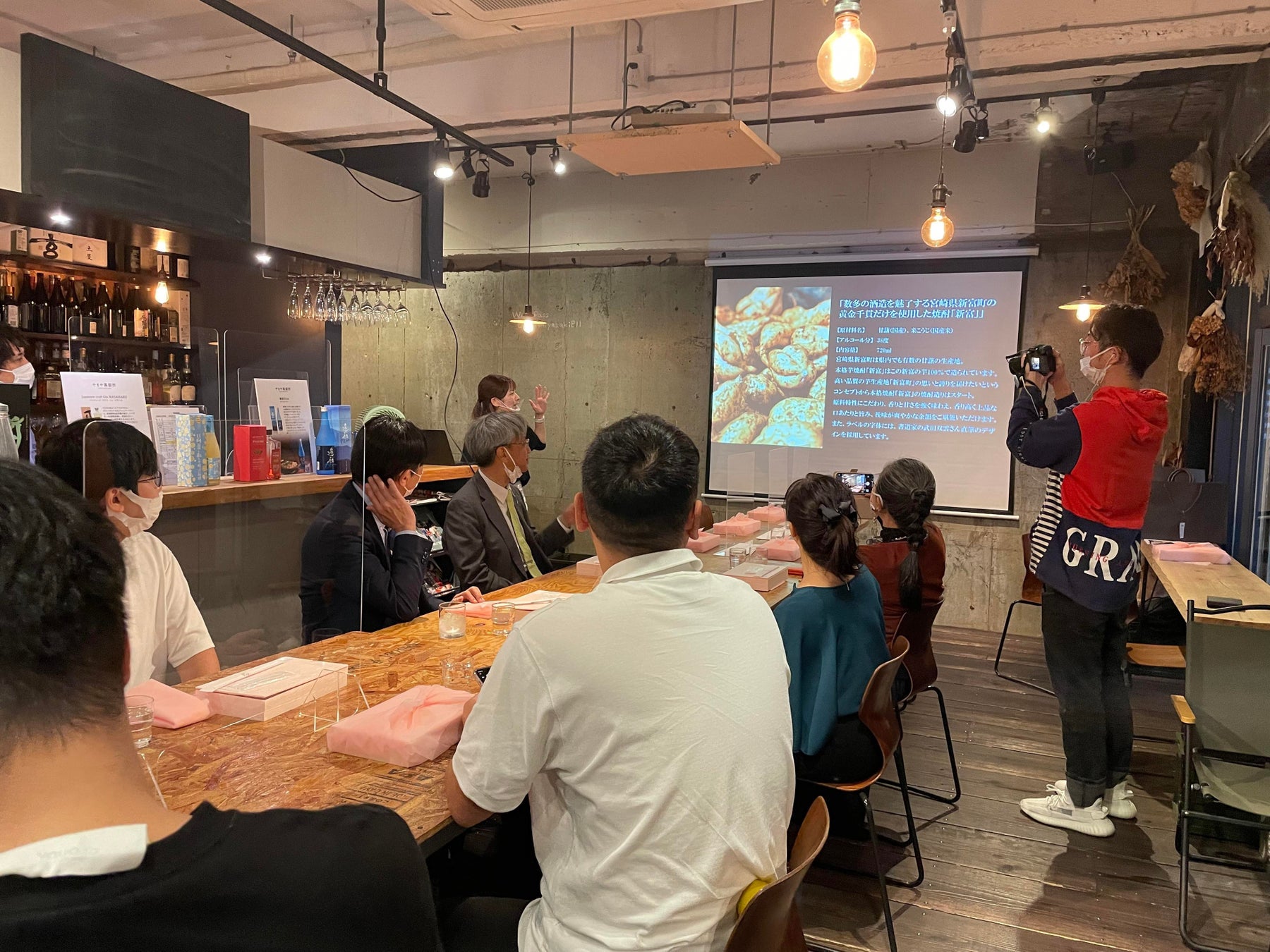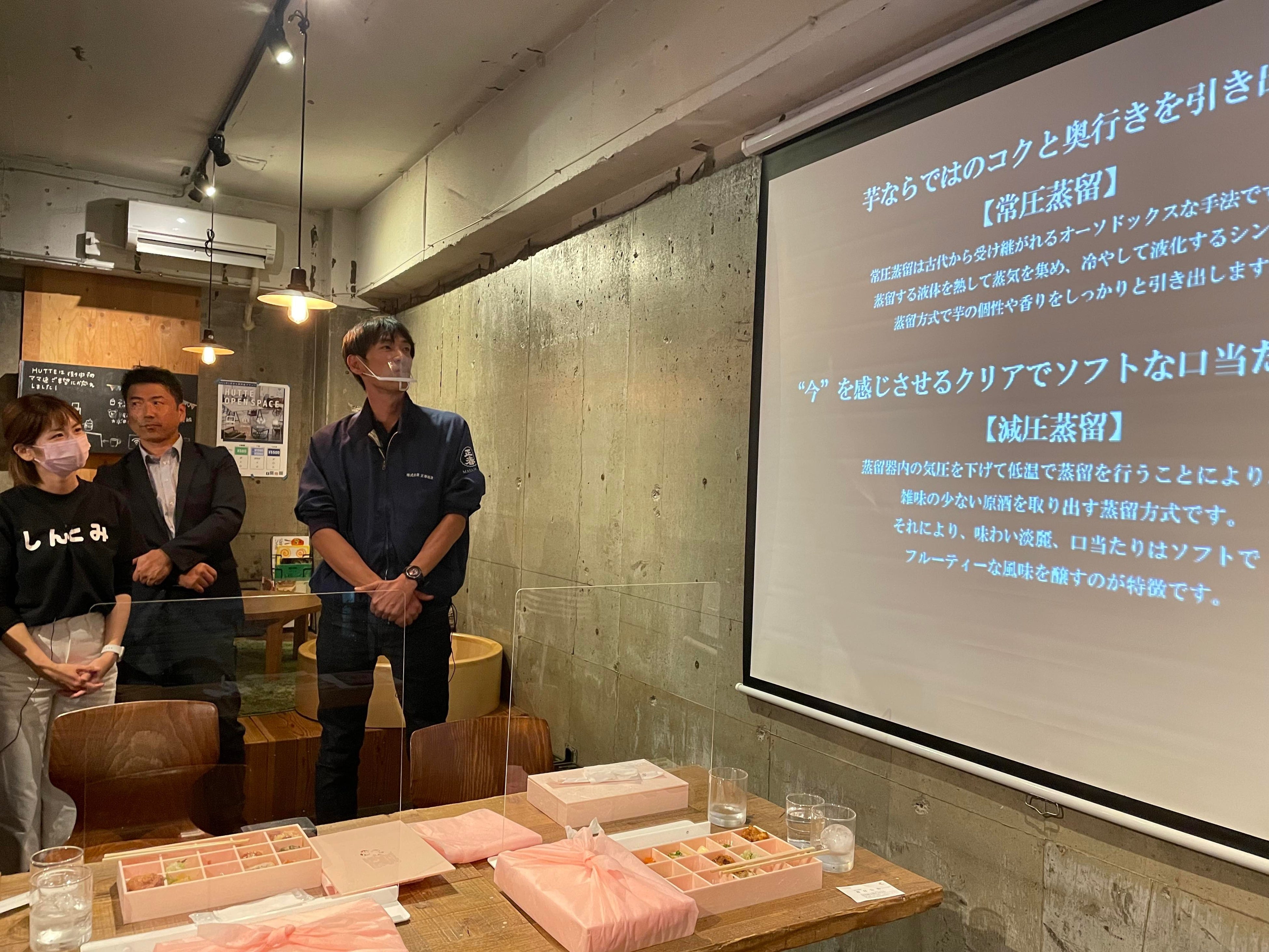 10月26日(水)には、新富町産のさつまいも(黄金千貫)を100%使用した本格芋焼酎「焼酎新富」の試飲会を、宮崎市内にて行いました。焼酎新富をつくった杜氏が参加し、さまざまな質問が飛び交う場となりました。