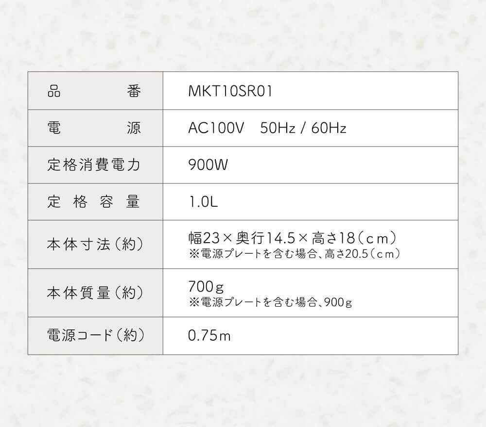 ※満水時、MKT08SR02(0.8L)は約5分10秒、MKT10SR01(1.0L)は約7分00秒ほど、沸騰までの時間を要します。