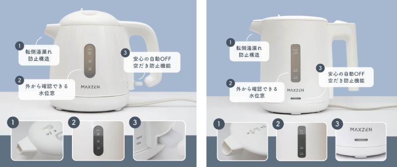 転倒湯もれ防止構造、電源自動OFF・空焚き防止機能など安全性と使いやすさを追求した電気ケトルを、ジェネリック家電ブランド「MAXZEN」より2025年12月8日より順次発売