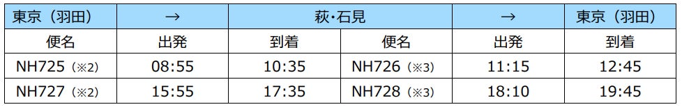 ※1首都圏と島根県西部とを直結する唯一の交通手段である東京(羽田)=萩・石見線は、羽田発着枠政策コンテスト(国土交通省が羽田空港の発着枠を地域と航空会社からの提案内容を評価し地域に分配することで、地方航空路線の活性化を図る制度)により、2014年の夏ダイヤから1日2往復を運航しており、2029年3月24日の冬ダイヤまでを前提として継続運航が決まっています。