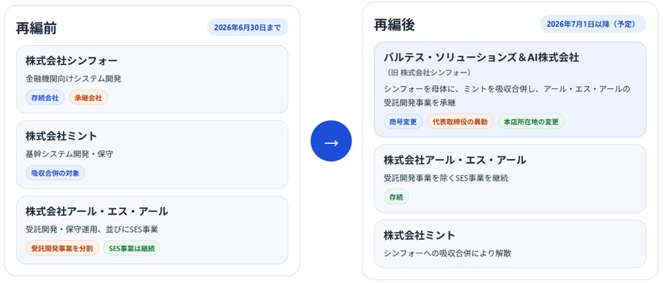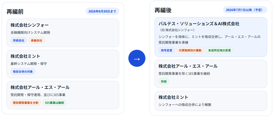 本組織再編および商号変更に伴い、受託開発事業集約後の事業運営体制を強化し、グループ戦略との一層の連携を図るため、株式会社シンフォー(商号変更後:バルテス・ソリューションズ&AI株式会社)の代表取締役を異動するものです。