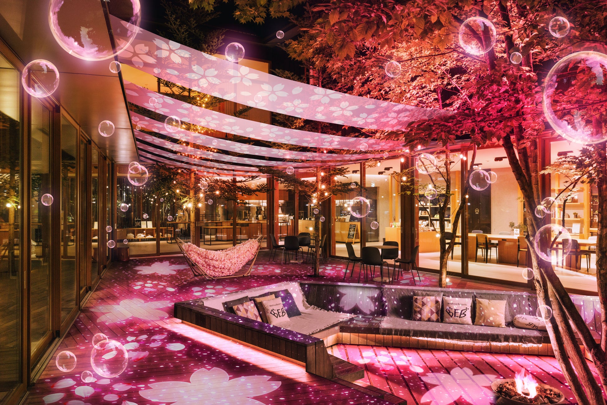 「居酒屋以上 旅未満 みんなでルーズに過ごすホテル」をコンセプトとする「星野リゾート BEB5軽井沢(ベブ)」は、2024年4⽉1⽇から5⽉10⽇の期間、真夜中まで楽しめる桜の映えイベント!「夜桜チルナイト」を初開催します。パブリックスペース「TAMARIBA(タマリバ)」の中庭を囲むような設計を活かして、夜桜をテーマにした空間を演出します。空を見上げれば、桜をイメージした装飾、ウッドデッキには桜を投影します。定期的にシャボン玉が噴射され、まるで桜が舞っているかのような演出があり、四方八方桜を楽しめます!また、夜桜パフェで小腹を、夜桜ハンモックでチルな気持ちを満たします。