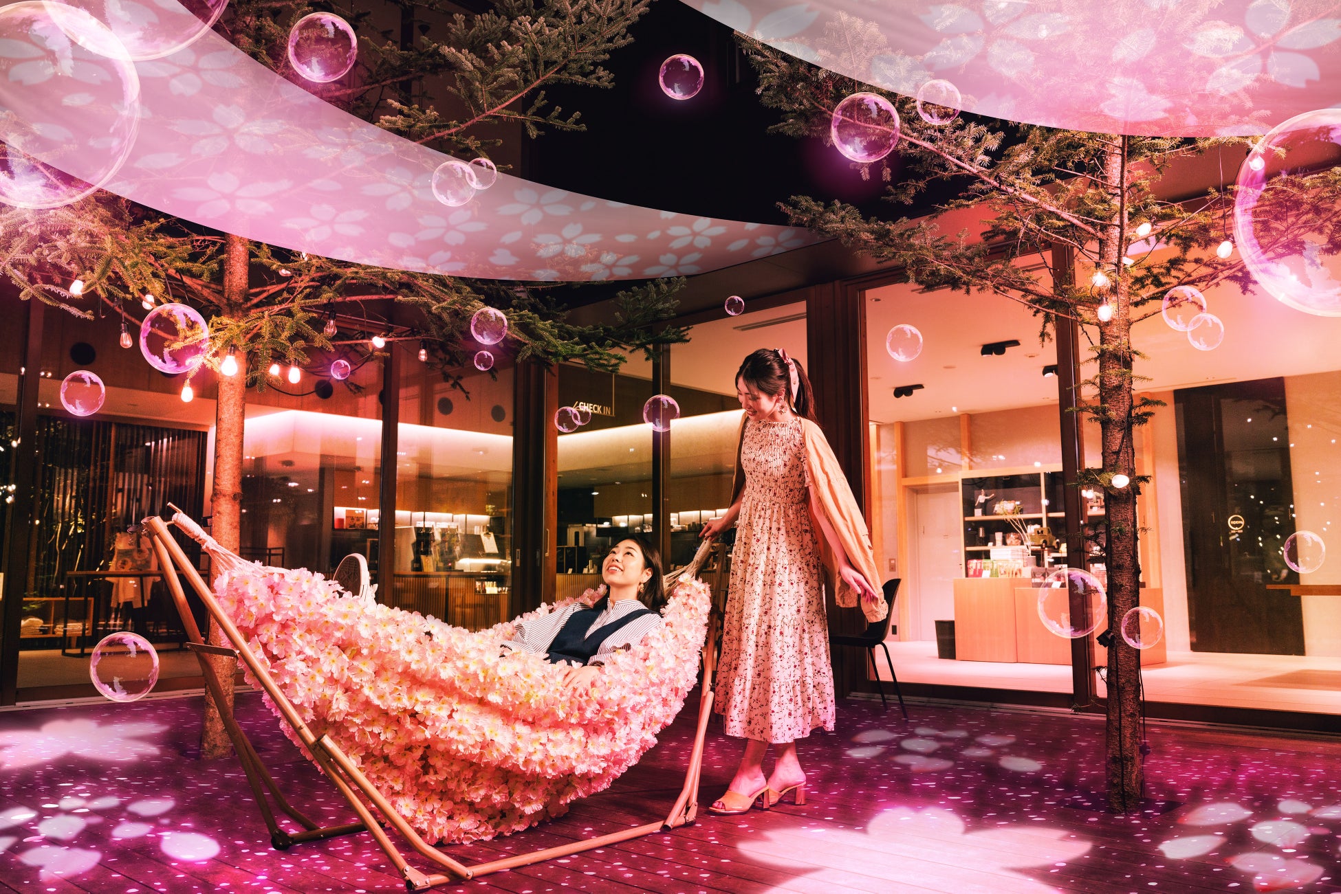 「TAMARIBA」中庭の夜桜空間をのんびりルーズに楽しめる、夜桜ハンモックが登場!夜桜空間と一体化、まるで桜に包まれているかのように桜の装飾をふんだんに使用したハンモックです。夜桜ハンモックに揺れながら、空を見上げてひらひらとした桜の装飾やシャボン玉を眺めれば、チルなナイトタイムを過ごせます。
