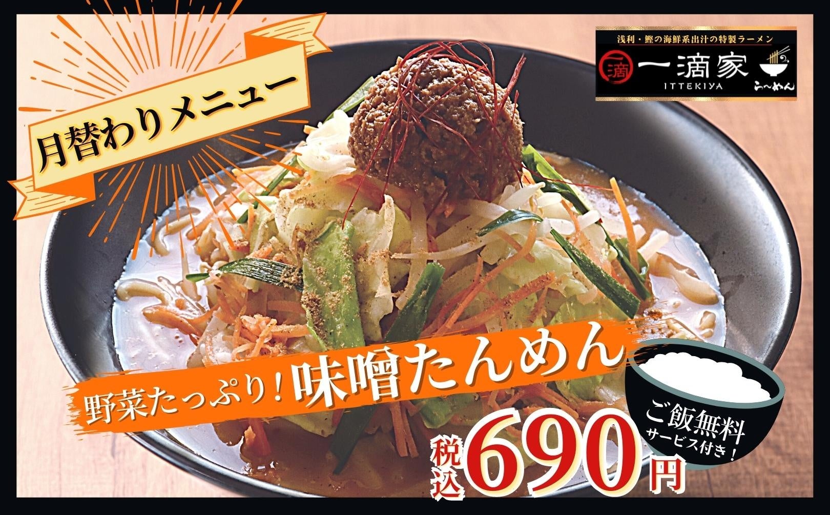 【月替わり特別メニュー登場!】“ワイズキャフェテリア”新宿エステックビル店の『一滴家』にてボリューム満点『野菜たっぷり味噌たんめん 税込690円』が登場!いつでも嬉しい『ご飯無料』のサービス付き!
