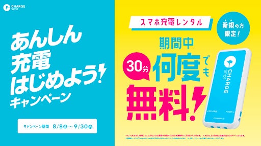全国の「ChargeSPOT」が新規ユーザー限定で30分間無料に!駅やコンビニ、観光地などで気軽にお試しください。