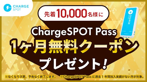 「ChargeSPOT Pass」月額プランを、先着1万人に限り初月無料でご提供。アプリ内やご登録いただいているメールを通じて、日頃からご利用いただいているユーザーの皆さまへ、いち早くご案内いたします。