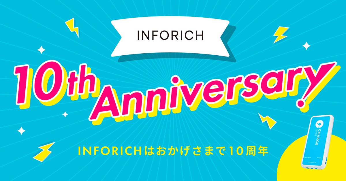 今年の9月2日でINFORICHは「満10年」。ユーザーの皆様には「満充電」で快適な生活を提供するため、感謝の思いを込めて10個の企画を実施します。今後ますます、社会インフラを担うという自覚を持って、サービスを磨くことを怠らず、利便性と遊び心ある使い方を追求してまいります。