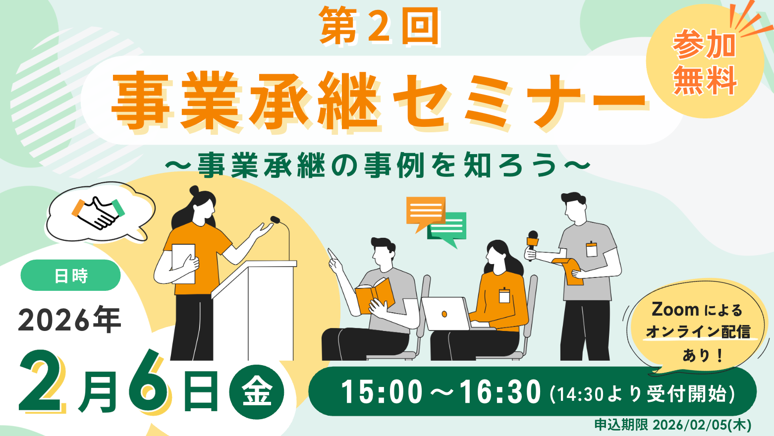 第2回目のセミナーでは、事業承継をより身近なものと感じていただくため、実際に親族内承継や従業員承継を経験された方をゲストとしてお招きし、トークセッションによる事例紹介等を行います。
