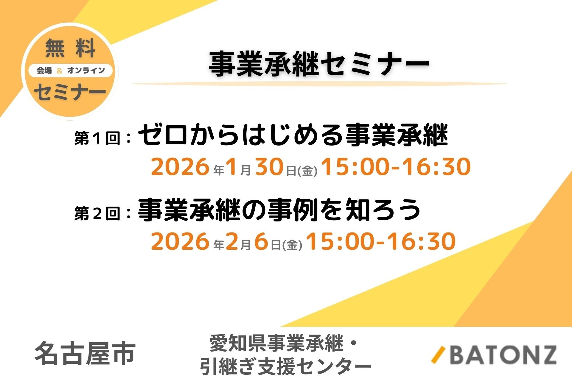 M&A・事業承継支援プラットフォーム「BATONZ(バトンズ)」を運営する株式会社バトンズ(本社:東京都中央区、代表取締役CEO:神瀬悠一、以下バトンズ)は、名古屋市および愛知県事業承継・引継ぎ支援センターと連携し、中小企業の経営者や後継者候補を対象とした「事業承継セミナー」を、2026年1月30日(金)、2月6日(金)に開催します。