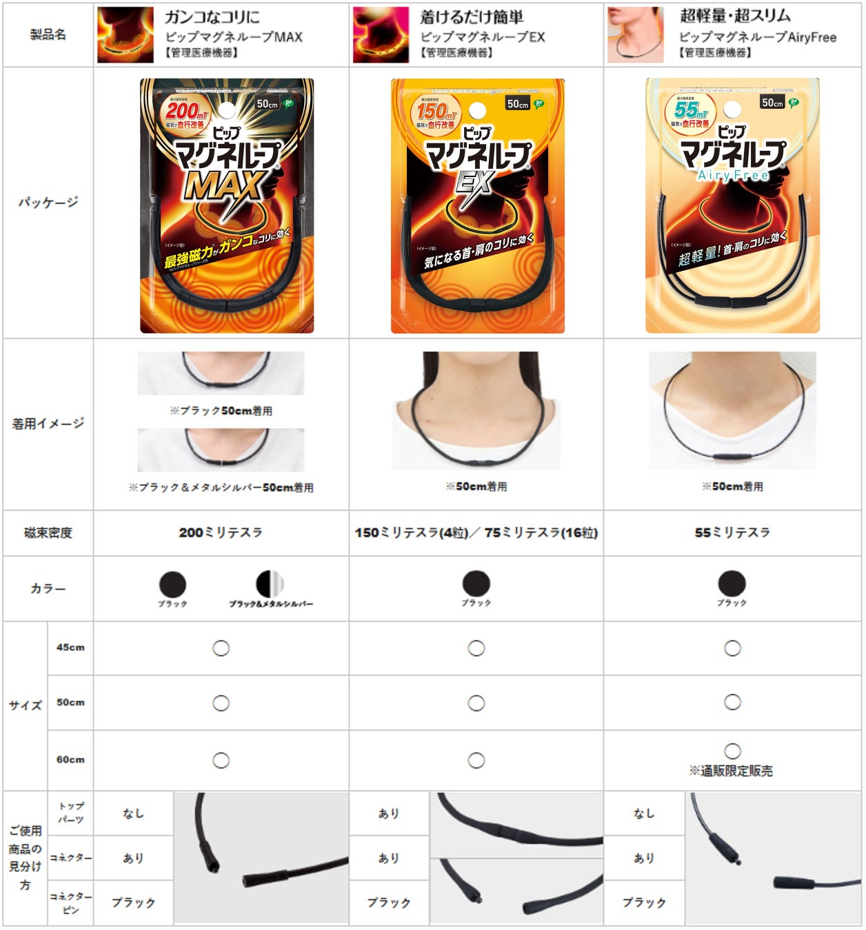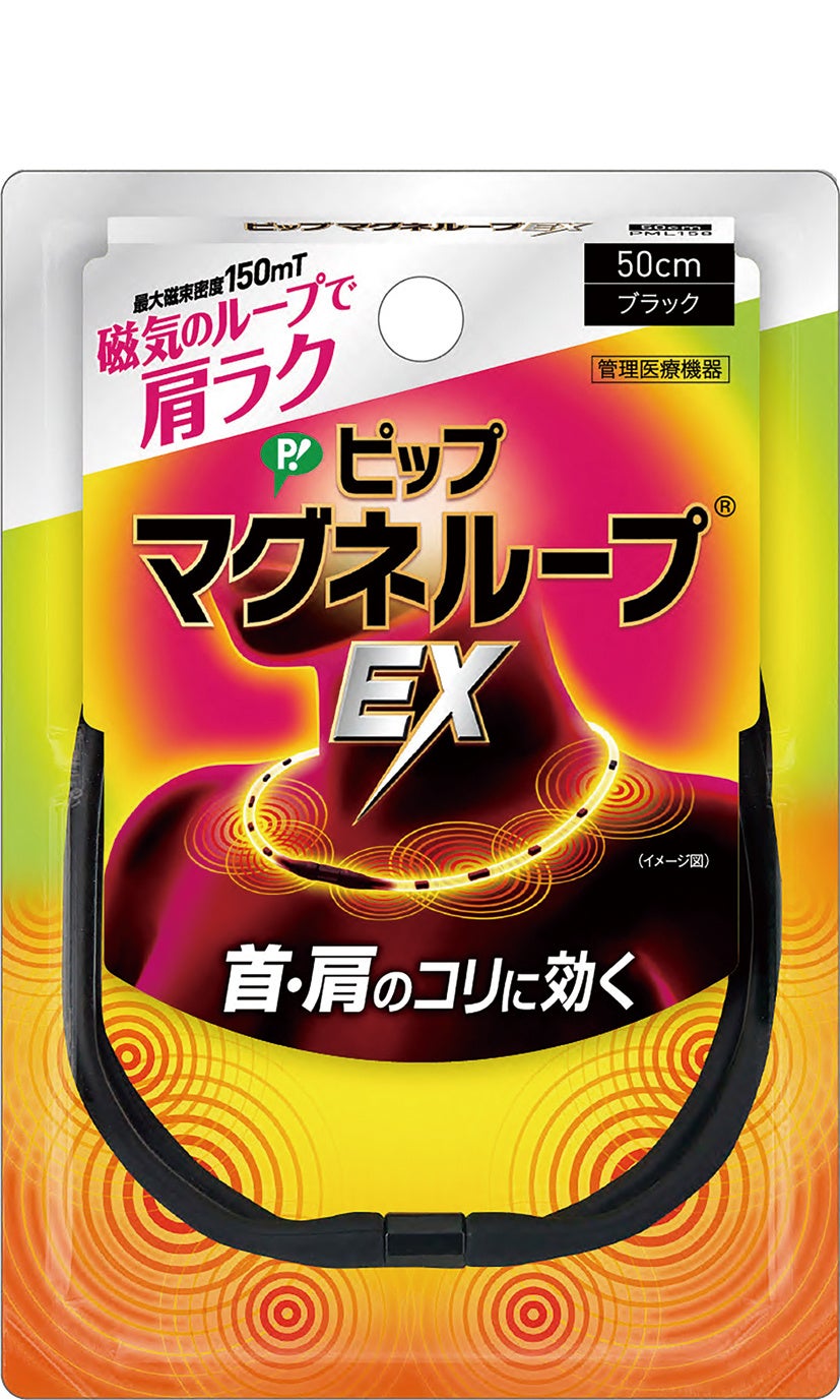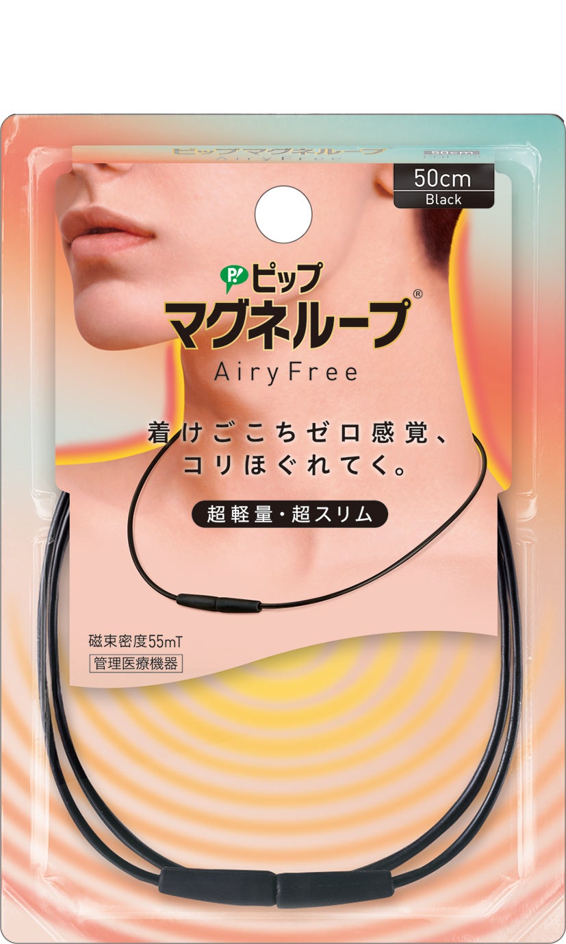 「ピップマグネループ」シリーズの中の定番品である「ピップマグネループEX」をはじめ、ループの細さと軽いつけ心地が特長の「ピップマグネループAiryFree(エアリーフリー)」や、シリーズ最強の200ミリテスラの強力磁力がガンコなコリにしっかり効く「ピップマグネループMAX」をご用意しています。
