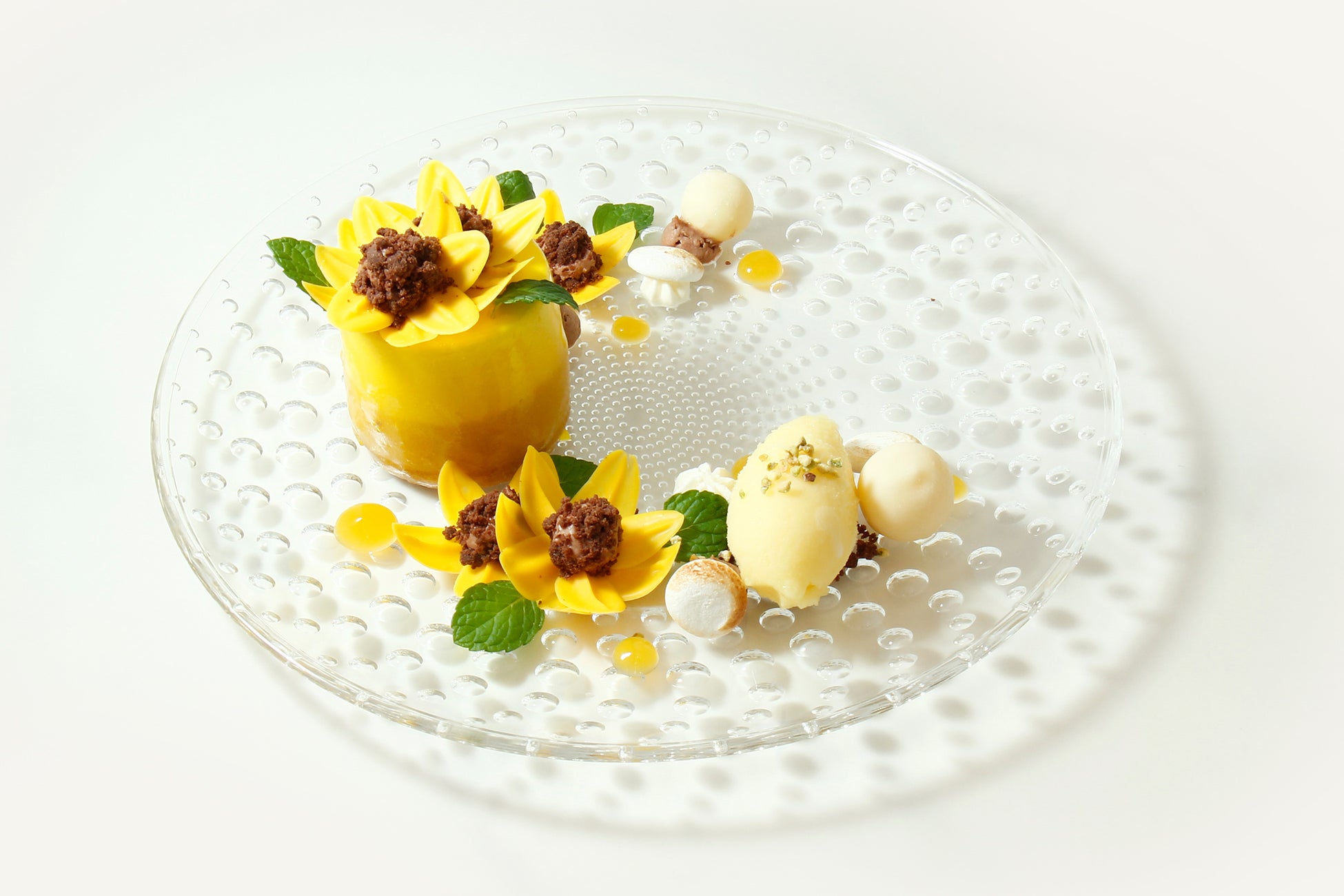 レモンとミルクチョコのムースで作ったプチガトーの周りに、柑橘のクリーム、夏みかんのソルベやレモンのメレンゲなどを散らしました。