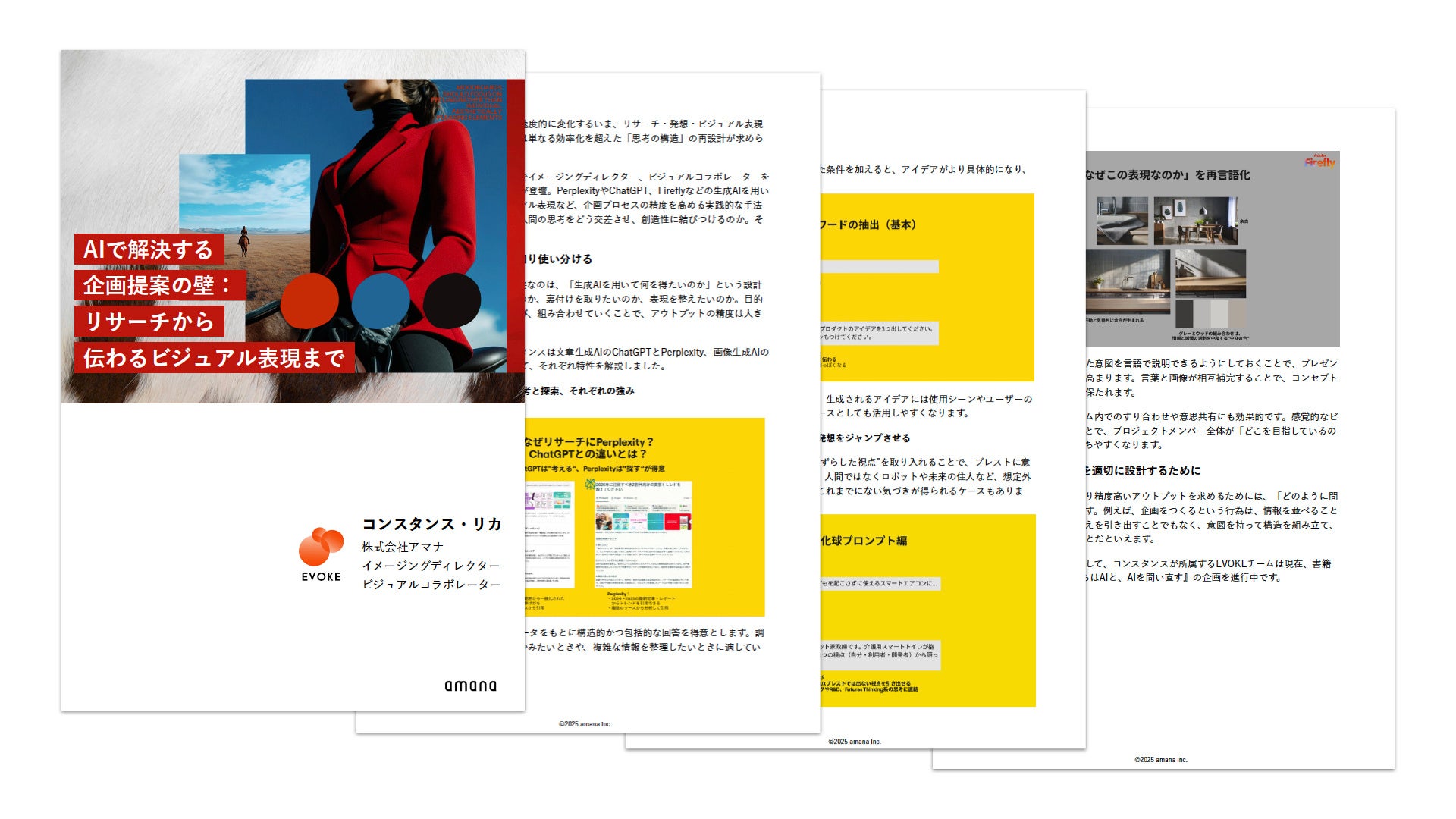 こうした背景からアマナでは、イメージングディレクター・ビジュアルコラボレーターのコンスタンス・リカによるウェビナーを開催。ChatGPTやPerplexity、Adobe Fireflyなどの生成AIツールを活用し、企画提案やビジュアル制作の“質”をどう高めていけるかを具体的に解説しました。今回、その内容をまとめたレポート資料を無料で公開。ツールの実践的な使い方に加え、「AIと人の思考をどう交差させ、創造性へとつなげるか」といった視点も盛り込んでいます。