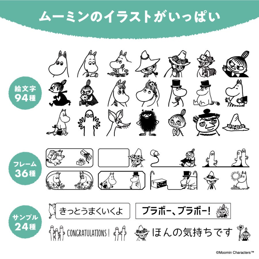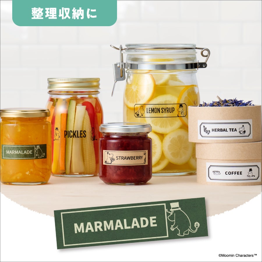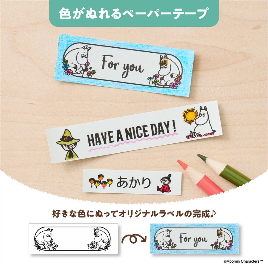 ラベルに使用できるデザインは、「ムーミン」や「リトルミイ」、「スナフキン」などのメインキャラクターをはじめ、ファンから愛されるサブキャラクターを含めた絵文字が94種類、フレーム36種類、キャラクターとメッセージを組み合わせたサンプル24種類と豊富に用意しました。お気に入りのキャラクターを使った、収納ラベル、メッセージラベル、お名前ラベルなどを作成できます。テープ幅は3.5mm~24mmに対応し、24mmテープでは、拡大印刷した最大4枚のラベルを組み合わせると大きなキャラクターラベルを楽しめます。また、紙素材のクラフトテープやペーパーテープに色鉛筆やペンで色付けすることで、オリジナルのラベルが作れます。