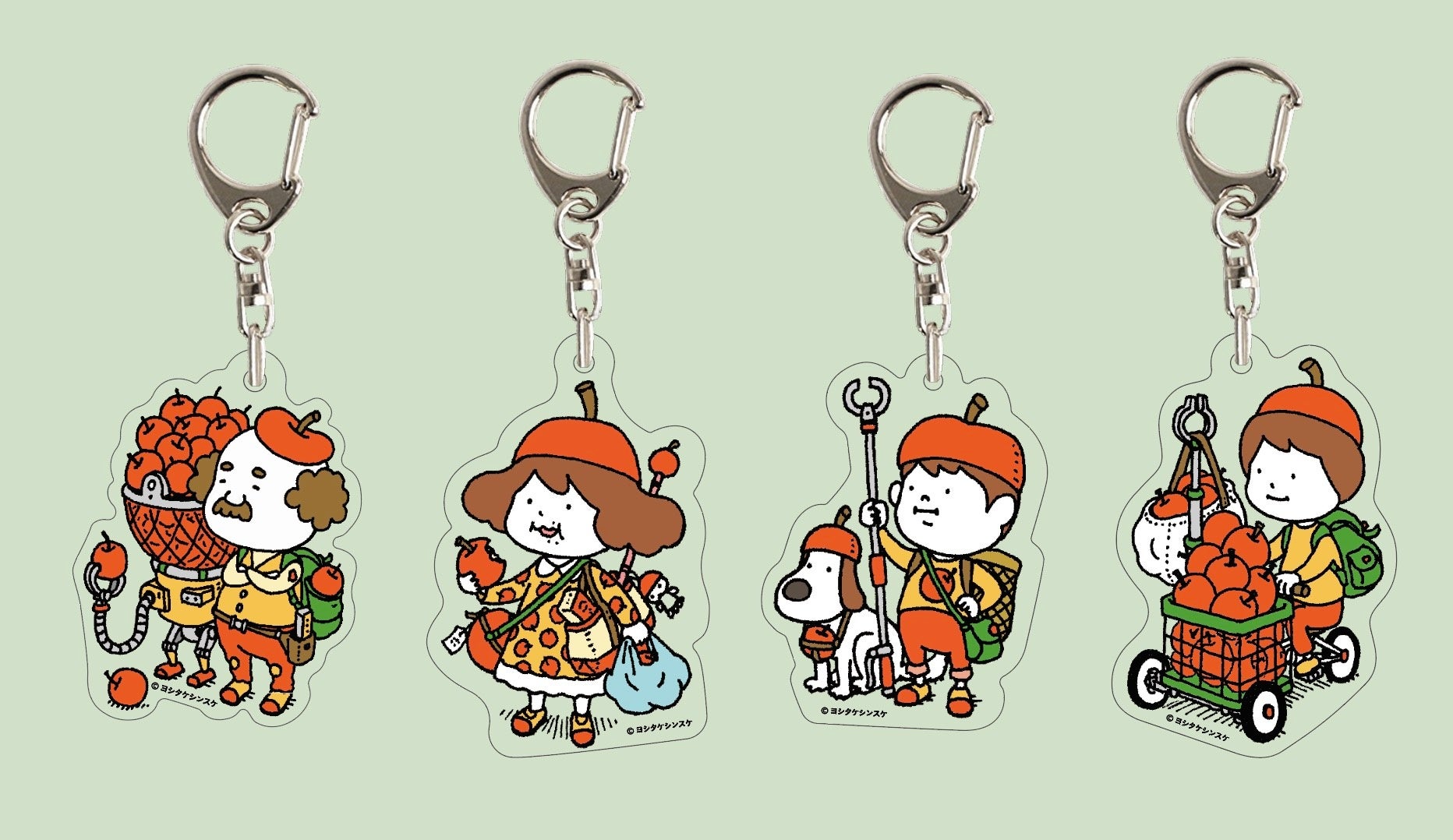 本イベントのタイトルはイラストレーター・ヨシタケシンスケさんの絵本『りんごかもしれない』からヒントをいただいています。そんなご縁もあり、メインビジュアルのイラストは、2021年からずっとヨシタケさんに描いていただいています。今年はりんごのベレー帽がお似合いのりんごのおじさんとりんごロボを描き下ろしてくださいました。会場限定で、アクリルキーホルダー(4種)とダイカットステッカーセットをご用意しました。りんごの木の下にもこの仲間たちのパネルがいますので、いっしょに記念撮影をしてくださいね。
