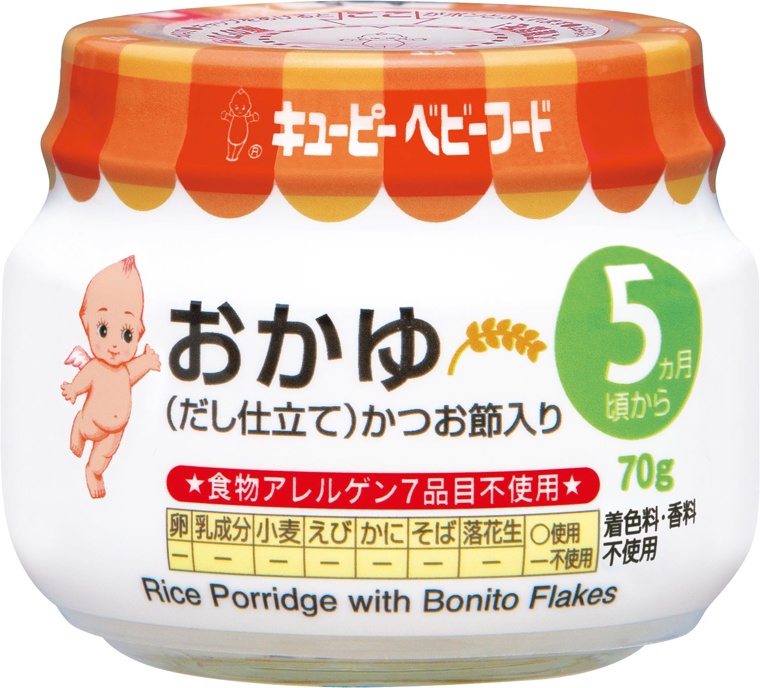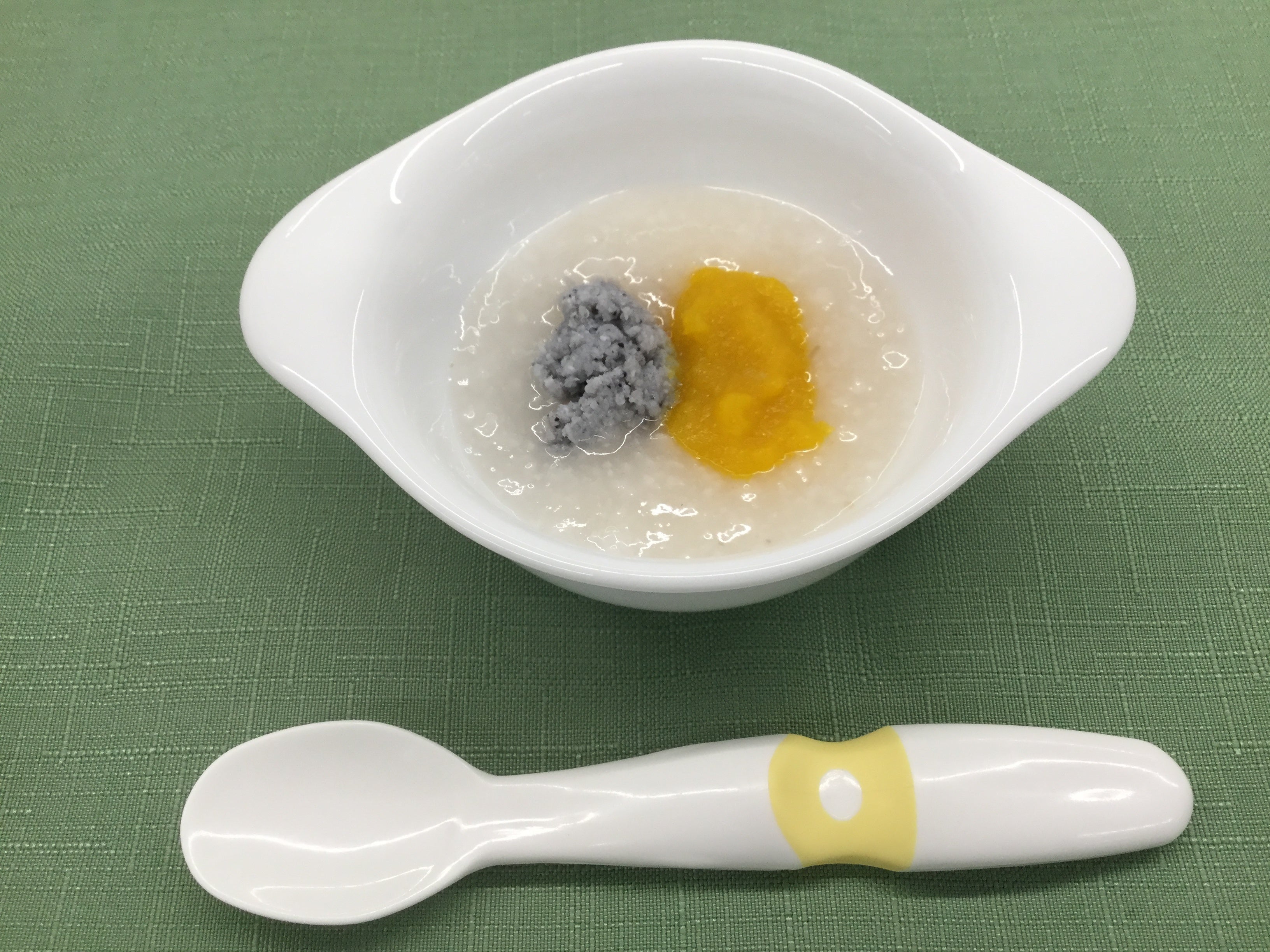 <離乳食作り一例> メニュー:「しらすとかぼちゃのおかゆ(5カ月頃から)」(左)、使用商品:「おかゆ(だし仕立て)」(右)