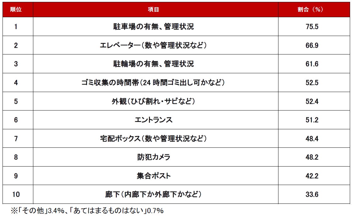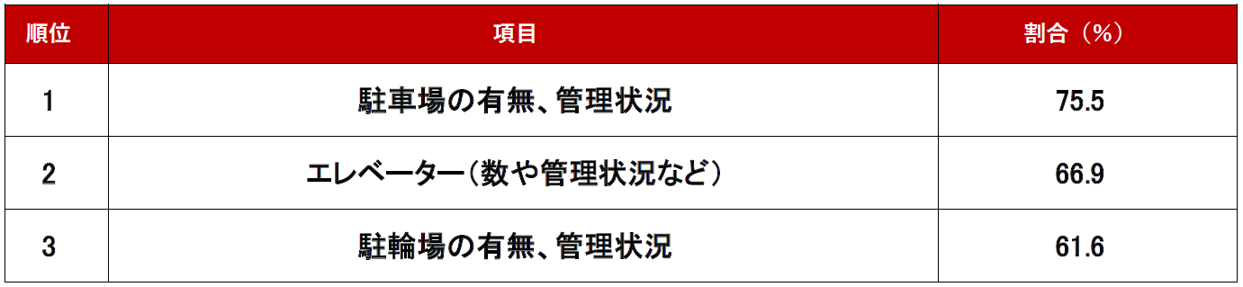 次いで3位は「駐輪場の有無、管理状況」で、不動産会社からは「小さいお子さまがいる場合、保育園送迎用の電動自転車を置けるスペースがあるかを気にされることが多いので、平面式の駐輪場の空き状況を伝えるようにしている」というコメントが寄せられました。中古マンションの場合はすでに入居している方がいて、駐車場や駐輪場の空きがない場合もあるので確認が必要です。