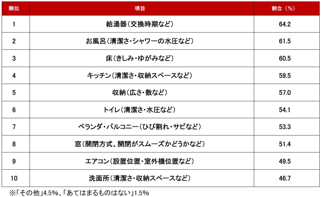 次いで3位は「床(きしみ・ゆがみなど)」で、不動産会社からは「床のきしみや傾きの確認、ドアの開閉がスムーズかどうかの建付け具合を確認したほうが良い」というコメントが寄せられました。一方で、「リフォームを前提とする場合は内装・設備等はあまり意識しない」というコメントもあり、購入後にリフォームするかどうかを視野に入れて物件探しをすると良さそうです。