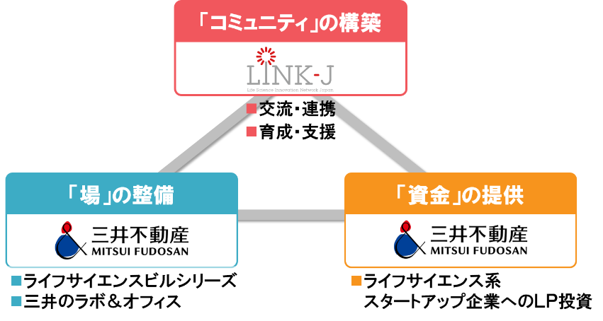 LINK-Jと三井不動産は、今後もコミュニティの構築と場の整備に一体で取り組み、新産業を創造してまいります。
