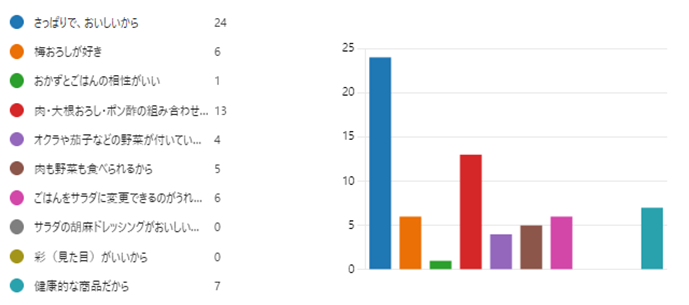 2商品のおすすめポイントとして、最も多くの票を集めたのは「さっぱりで、おいしい」というポイントでした。以下2位は「肉・大根おろし・ポン酢の組み合わせが合うから」、3位は「健康的な商品だから」です。