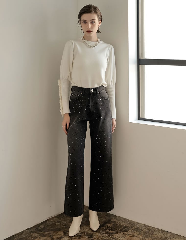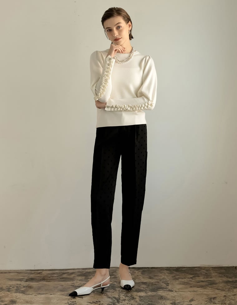 袖口のフリルとビジューが、クラス感漂うエレガントニットが登場。