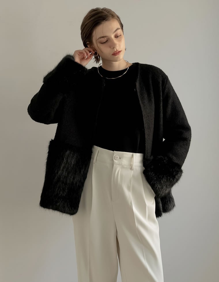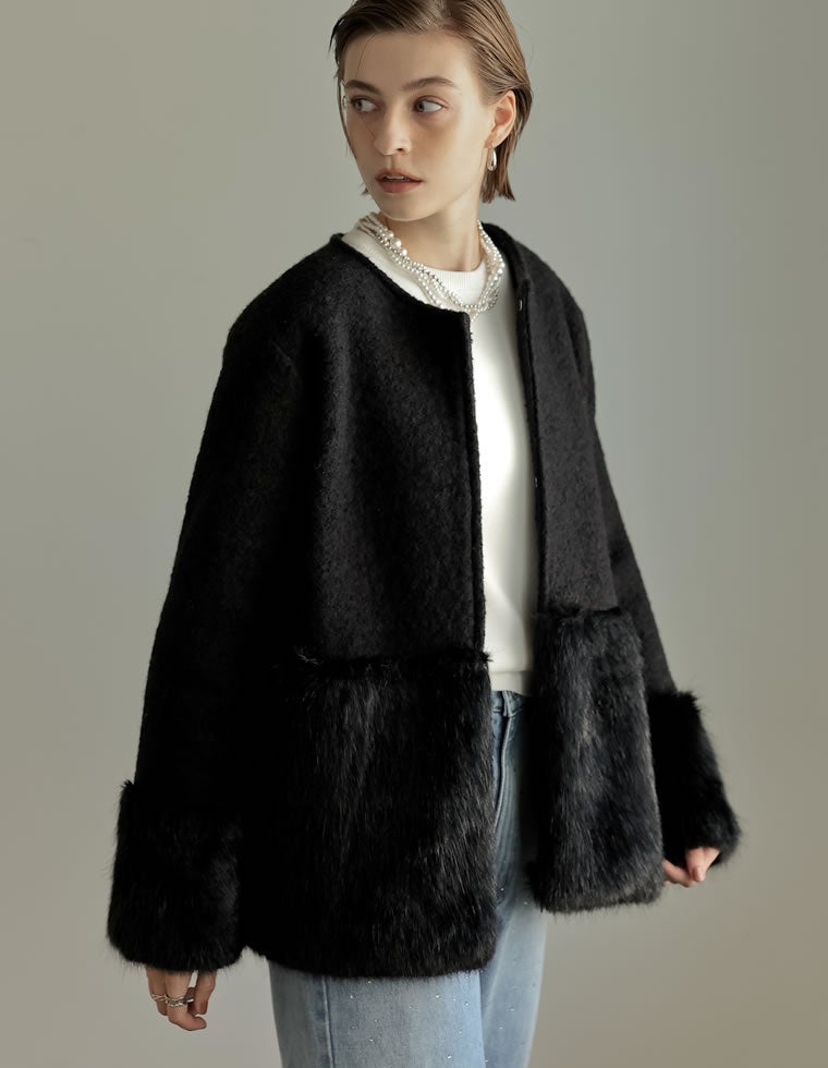ウールタッチの風合いと、フェイクファー素材の切り替えデザインが印象的なノーカラージャケット。