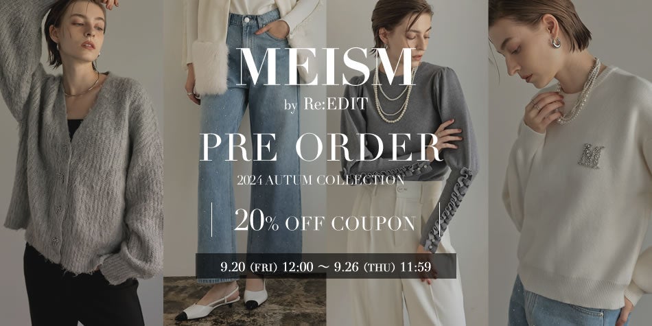株式会社ネオグラフィック(本社:大阪市西区/代表取締役社長:工藤 正樹)の30代~40代向けブランド「MEISM by Re:EDIT(ミズムバイリエディ)」が、9月20日(金)正午から9月26日(木)11時59分まで、2024秋のプレオーダーを開催します。MEIMSプレオーダー対象アイテムに限り、合計12,000円以上のお買い物に使える、20%OFFクーポンをプレゼントいたします。