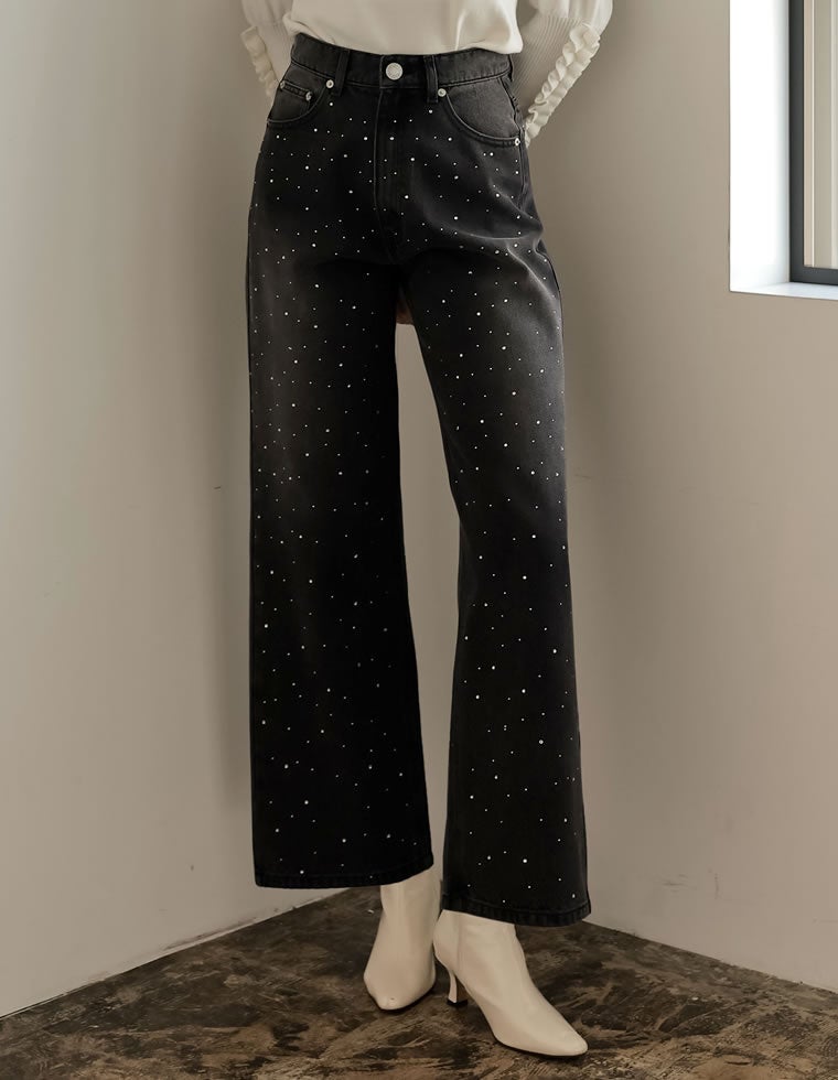[MEISM by Re:EDIT][低身長/高身長サイズ有]ラインストーンコットンデニムバギーパンツ
