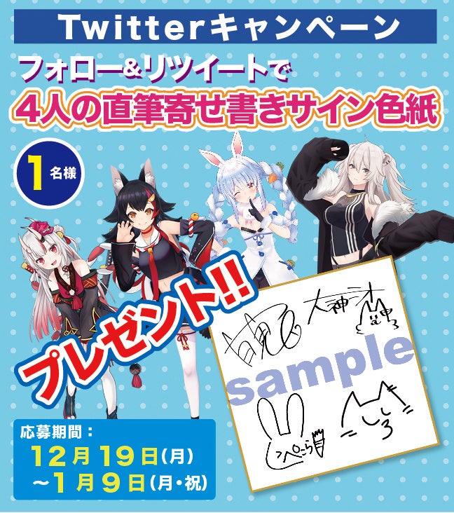 ■百鬼あやめ・大神ミオ・兎田ぺこら・獅白ぼたんの直筆寄せ書きサイン色紙が抽選で1名さまに当たるTwitterキャンペーン開催