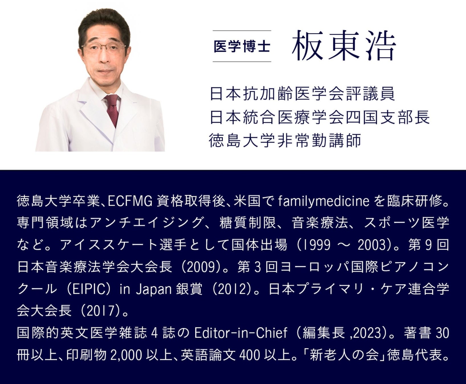 アンチエイジング、糖質制限、音楽療法、スポーツ医学などを専門、医学博士の板東浩先生との共同開発
