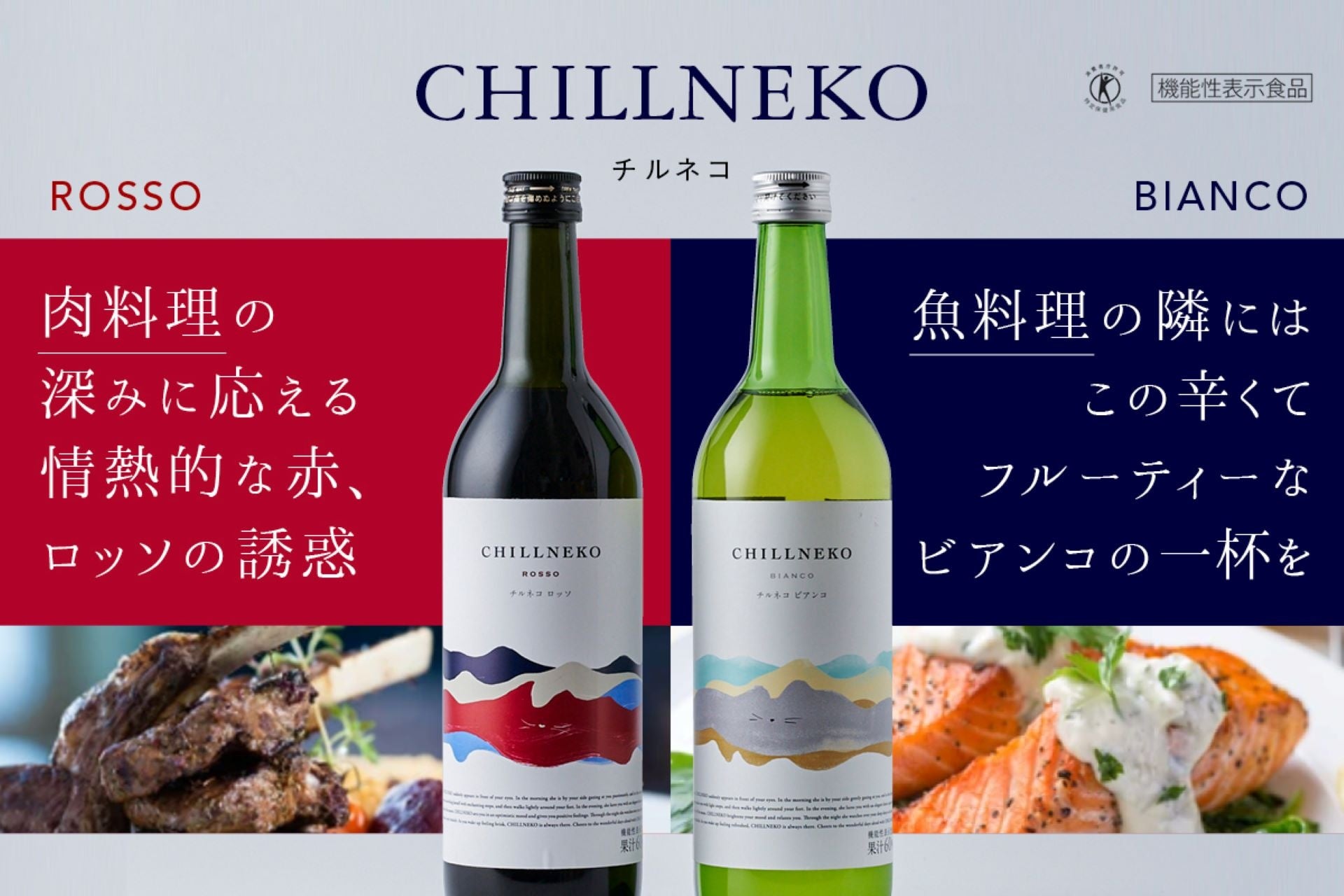CHILLNEKO(チルネコ)は、イタリア産のブドウと100年以上の歴史を持つオーク樽の香りを基調に、大麦を乳酸発酵させて作ったGABAを配合したワイン好きのためのウェルネスドリンクです。ウェルネスドリンクとは、フィジカルやメンタルの健康に良い効果のあるドリンクのこと。アルコール分は0%ながら、料理との絶妙なマリアージュを楽しめる赤と白の二つの味をラインナップ。心と体をやさしく包み込むリラックス感を、食事とともに体験してください。