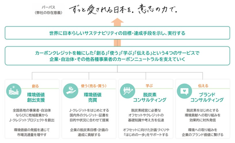 バイウィル社は、環境価値に関する「創る」「使う」「学ぶ」「伝える」の4つのサービスを通じて、脱炭素・カーボンニュートラルの達成に向け、カーボンクレジット*1の創出・活用による「環境価値と経済価値の循環」に取組んでおります。