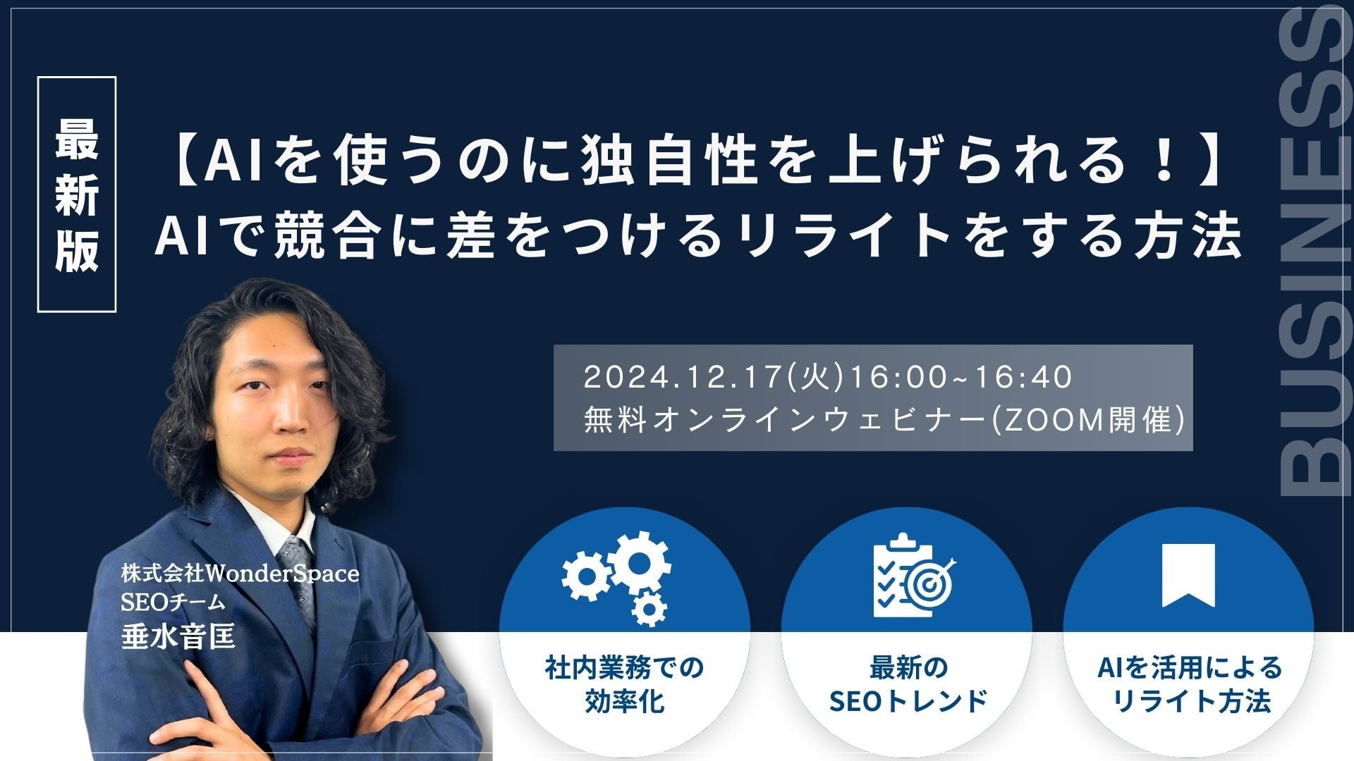 『【AIを使うのに独自性を上げられる!】AIで競合に差をつけるリライトをする方法』無料ウェビナー開催