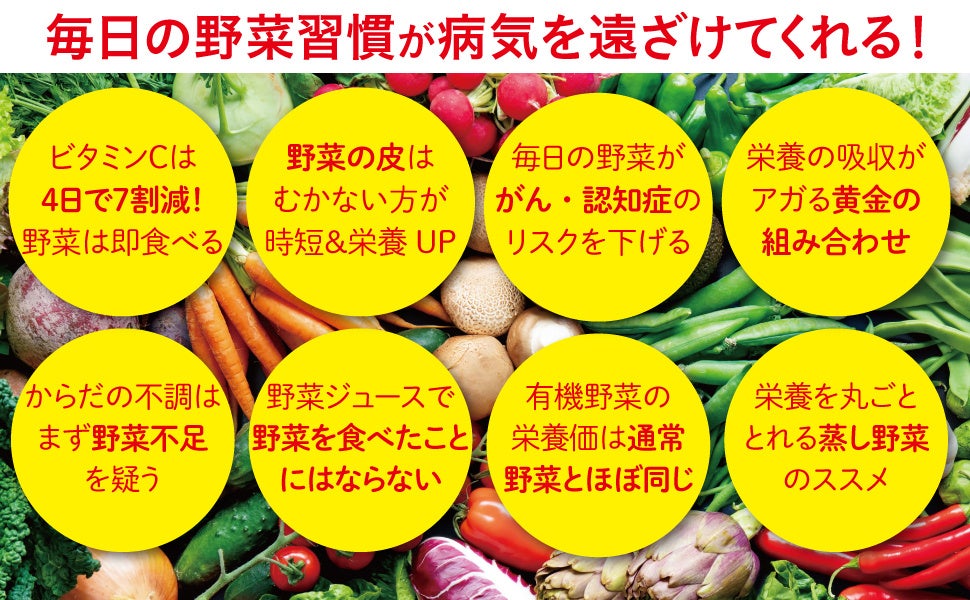 厚生労働省が1日350グラム摂ることを推奨しているように、私たちの健康に野菜は欠かせません。でも、実際はぜんぜん量が足りなかったり、間違った食べ方のせいで栄養が十分摂取できていなかったりして、野菜の栄養をからだに生かすことは意外に難しいのです。