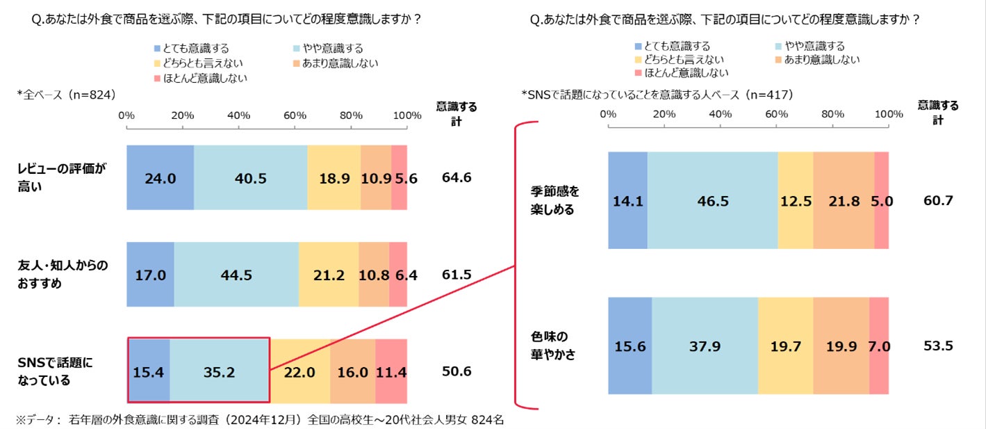 10~20代の男女824人を対象に、外食時の商品選択で意識することについて調査したところ、商品選択傾向としては「馴染みのある定番商品」を選ぶ人の割合が全体で75.1%となり、その理由としては「失敗したくない」と回答した人が若年女性を中心に43%となりました。また、商品を選ぶ際の意識としては「レビューの評価が高い」や「SNSで話題になっている」といった項目を重視するという回答は半数以上に上がり、人に勧めたくなるような“話題性”が高いことが重要であることが判明しました。さらにSNSでの話題性としては「季節感を楽しめること」を重視する人は60.7%、「色味の華やかさ」は53.7%とこちらも半数以上となっています。
