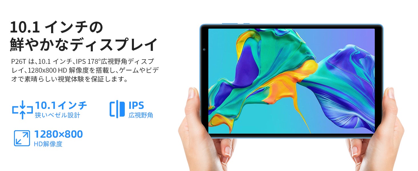 Teclast「P26T」は、10.1インチ、IPS 178°広視野角ディスプレイ、1280x800 HD解像度を搭載し、ゲームやビデオで素晴らしい視覚体験を保証します。6mm幅の超薄型ロングエッジベゼルを採用し、従来の10インチタブレットよりもスリムになっています。背面には、特殊なウェーブパターンのテクスチャーデザインで、手になじみ、滑りにくく、さまざまな光の条件下で光を反射させることができます。