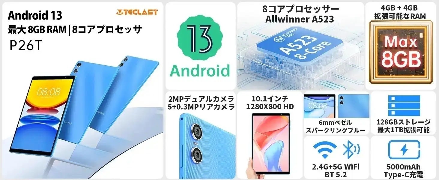 10インチ / Android 13 / 8GB(4+4GB拡張)RAM+128GB ROM+1TB拡張 / WideVine L1対応 / WiFiモデル / デュアルカメラ / 画面分割 / 3.5mmヘッドフォンジャック / 児童守護